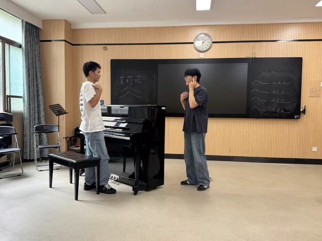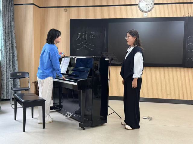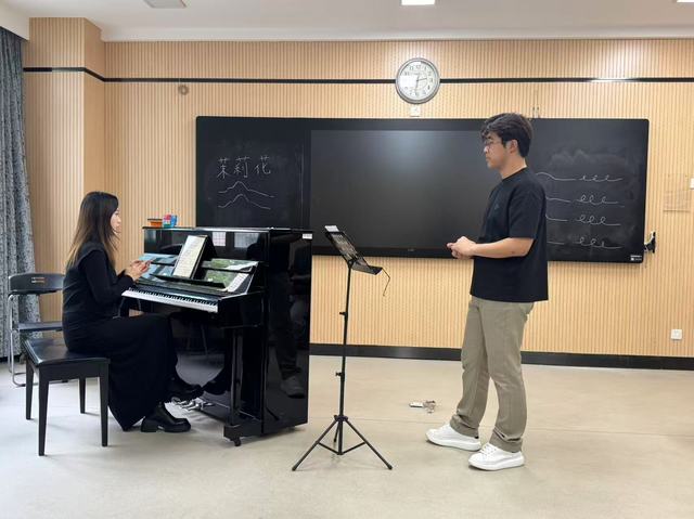 徐秋煜老师授课:面向2024级普本班学生授课,指导曲目为《悲叹小夜曲》和《桥》。课堂中,徐老师引导学生从分析歌曲风格出发,结合语音语调、作品情绪、演唱技巧进行系统训练,帮助学生建立艺术审美与表现力。观摩教师在肯定课堂逻辑清晰与教学重点突出的同时,也指出练声时间相对集中、可适当精简,进一步提升课程整体节奏感与完整性。