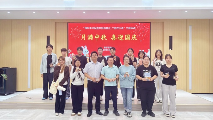 丹桂飘香庆华诞,琴韵悠扬话团圆。2025年9月29日晚,音乐学院“铸牢中华民族共同体意识•二师在行动”系列活动之“月满中秋 喜迎国庆”师生座谈会在C306会议室温馨举行。学院党总支书记、关工委主任尹彬成,党政办主任、关工委办公室主任韦利军,团总支书记、辅导员、关工委青年委员盛男与学院少数民族学生、新疆和福建籍留校学生代表齐聚一堂,以座谈寄情、以月饼传暖,在双节同庆的浓厚氛围中共叙师生情谊、共话青春理想。